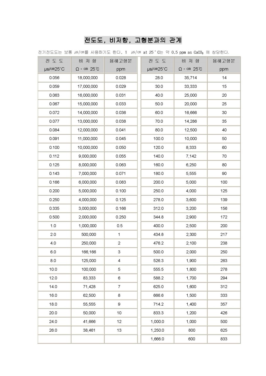 참고 : 1㏁/cm(1,000,000Ω/cm) = 1㎲/cm 가 표준 환산 지표로 사용. 역수 관계가 성립됨.