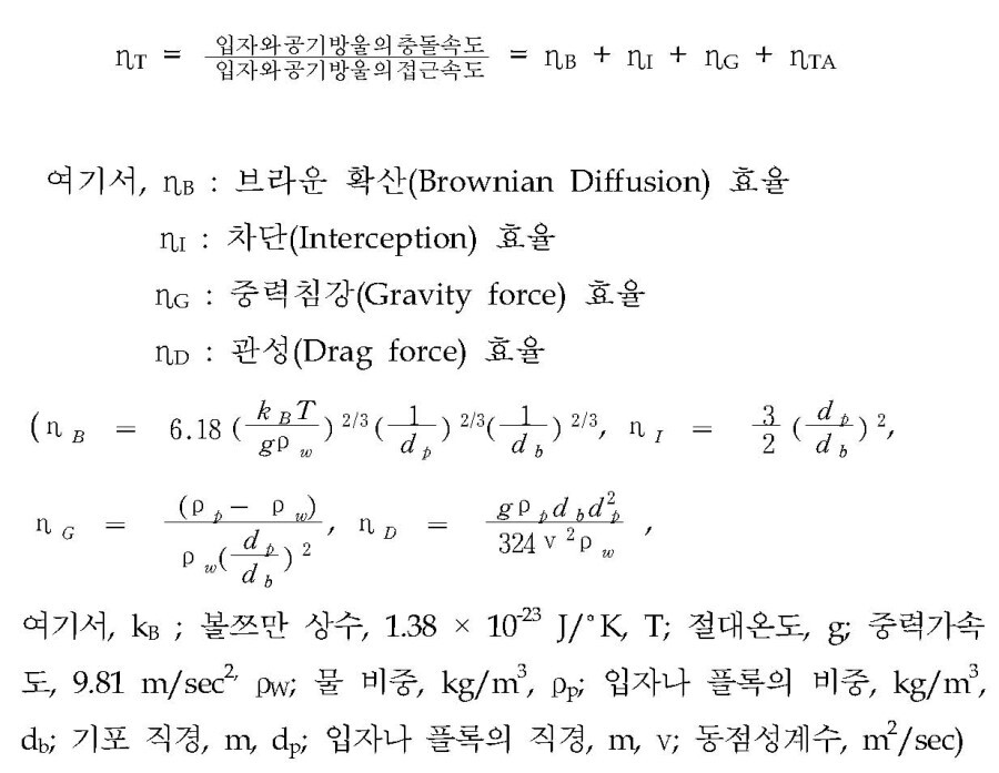 총 충돌효율(ηT)에 미치는 영향인자는 플록입자의 크기 및 비중, 기포의 직경, 수온, 물의 비중 및 동점성, 입자의 밀도 등이다.