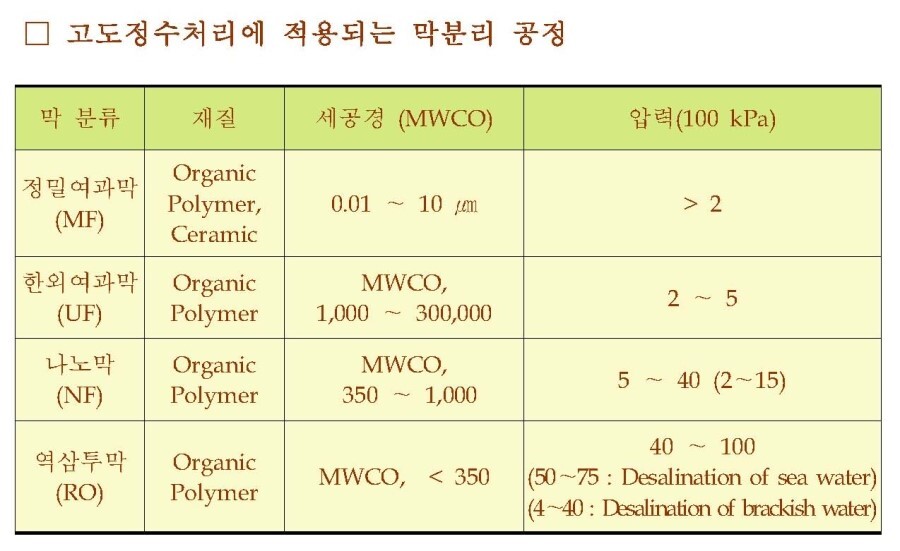 다음의 표는 막공정의 일반적인 특성을 나타내었고, 그 아래의 표는 고도정수처리에 이용되는 막공정의 물리적인 특성과 운전압력 범위와, 다른 고도처리 단위공정과 결합된막여과 공정의 처리특성을 나타내었다.