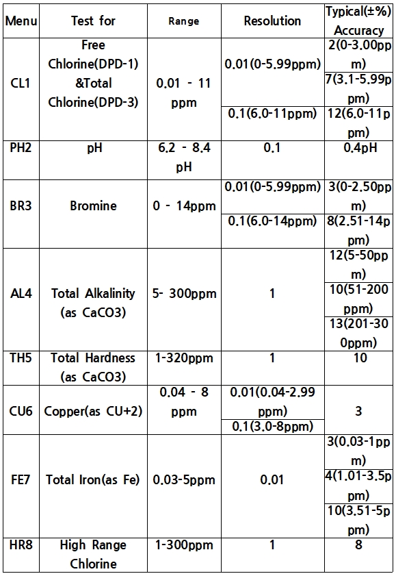 - 기본 7항목 - Free Chlorine, Total Chlorine, pH, Bromine, Total Alkalinity, Total Hardness, Copper,Total Iron,High Range Chlorine