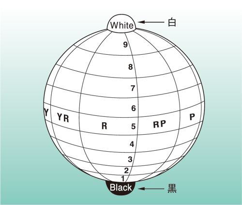색깔은 보고 느끼면서 인지되는 현상입니다.사람의 감각에 따라 체계화된 표현 방법이 세 가지 속성에 의한 표시 방법입니다.사람이 느끼는 색의 요소로서 색상, 명도, 채도를 정의하고 각각에 대해 지각적으로 등보도로 보이도록 체계화한 것으로 JIS 규격에 제정되어 있습니다.표 색은 색상 명도, 채도의 순서대로 표기하고 예를 들어 산뜻한 빨강은 5R 4/14라고 표시합니다.또, 색상이 없는 흰색이나 회색, 검정 등은 무채색 기호의 N과 명도에서 표시하고 N5등으로 표기합니다.