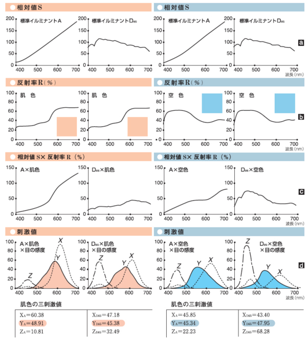 그림8은 세로 계열로 봐 주십시오.최좌열의 예는 표준 일루미넌트 A(전등빛에 상당)의 조명 아래에서 살색을 보았을 때 눈에 들어오는 빛은(A×살색)의 그림8(c)과 같은 분광분포입니다.이 빛을 받아, 눈은 그림 8(d)와 같이 삼색으로 느끼므로, 세 개의 자극치 XYZ의 각각의 양으로 느끼고 있는 것이 됩니다.그림에서 색이 있는 부분의 면적이 녹색으로 느껴지는 성분의 양이 됩니다.다음 줄은 같은 피부색을 표준 일루미넌트 D65(북쪽 하늘 주광에 상당)의 조명 아래에서 보았을 때 세 자극치 XYZ의 계산 예입니다.이러한 측색 계산에 의해서, 파장마다의 빛으로 나타나고 있는 색이 세 개의 수치(3 차원 좌표)로 나타낼 수 있게 됩니다.