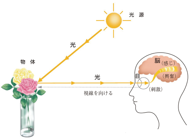 보통 물체에 시선을 돌리면 그 물체의 표면에, 마치 색이 도착해서 있는 것처럼 보입니다(그림 6의 점선).하지만 물체의 색깔은 어둠에서는 보이지 않고, 물체가 시야에 없으면 색을 볼 수 없습니다.또 눈을 감아도 색을 볼 수 없습니다.색은 조명하는 광원과 물체와 사람의 눈에 의해 지각되는 현상이므로 다음 정의의 순서로 색을 이해할 수 있습니다.