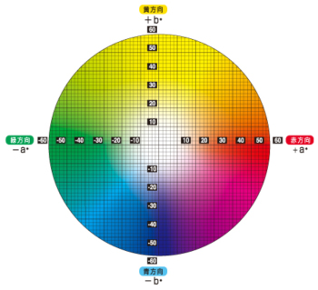 이와 같이 삼자극값의 좌표를 색감각에 대응하는 좌표로 변환하여 이용하는 것이 색채관리에 편리합니다.변환하는 방법은 JIS Z 8730(색의 표시 방법)에 제정되고 있는데 그 가운데 가장 널리 이용되고 있는 것이 L*a*b*표색계의 색도 그림입니다.그러므로 그 밝기를 가진 무채색의 좌표가 a*=0, b*=0의 원점 근방에 투영되고 있습니다.여기를 중심으로 바깥으로 벌어진에 따르고 색깔은 선명함을 더하고 갑니다(그림 9참조). 또한 이 a*-b*평면에 직교하고 밝기를 나타내는 L*축이 있습니다.이와 같이 지각되는 색과 대응을 취할 수 있는 색상의 좌표를 이용해 색채 관리에 유용하게 사용되고 있습니다.