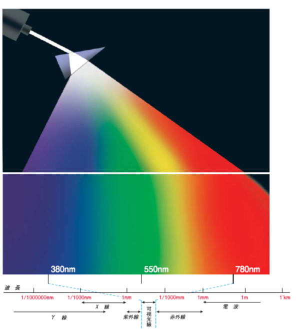 태양의 빛, 수은등의 빛, 전등 빛 등 광원의 종류에 따라서 방사되는 빛의 성질은 다르지만 모두 거의 380nm~780nm범위의 빛을 포함하고 있습니다.물체가그빛을어떻게반사하느냐에따라눈에들어오는빛의성질을알수있습니다.예를들면,빨간색종이는짧은파장의빛을흡수하고,긴파장의빛을잘반사하기때문에,눈에들어오는빛은단파장의빛이적고,장파장의빛이많아져서,눈에는빨간색으로보이게됩니다.또한 녹색종이는 단파장의 빛과 장파장의 빛을 흡수하기 때문에 중파장의 빛이 눈에 많이 들어옵니다.그러니까 초록색으로 보인다는 거죠.