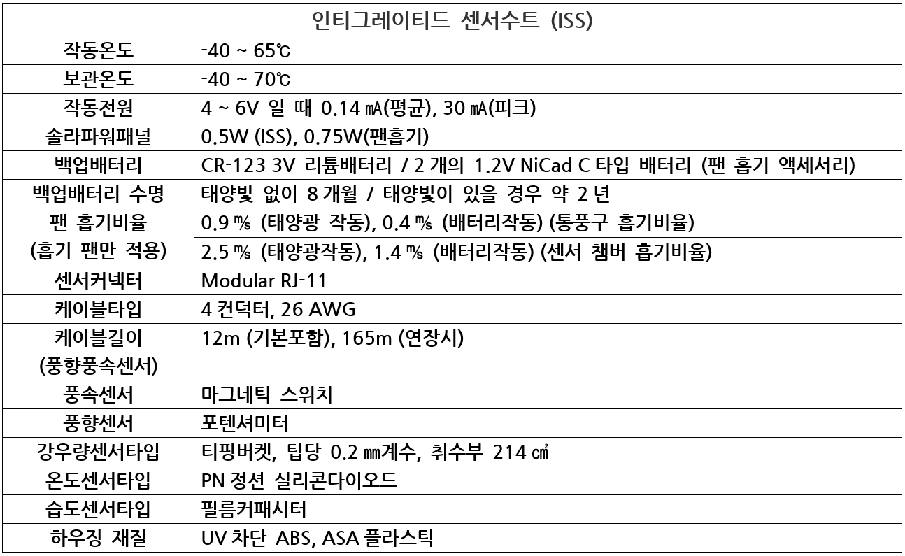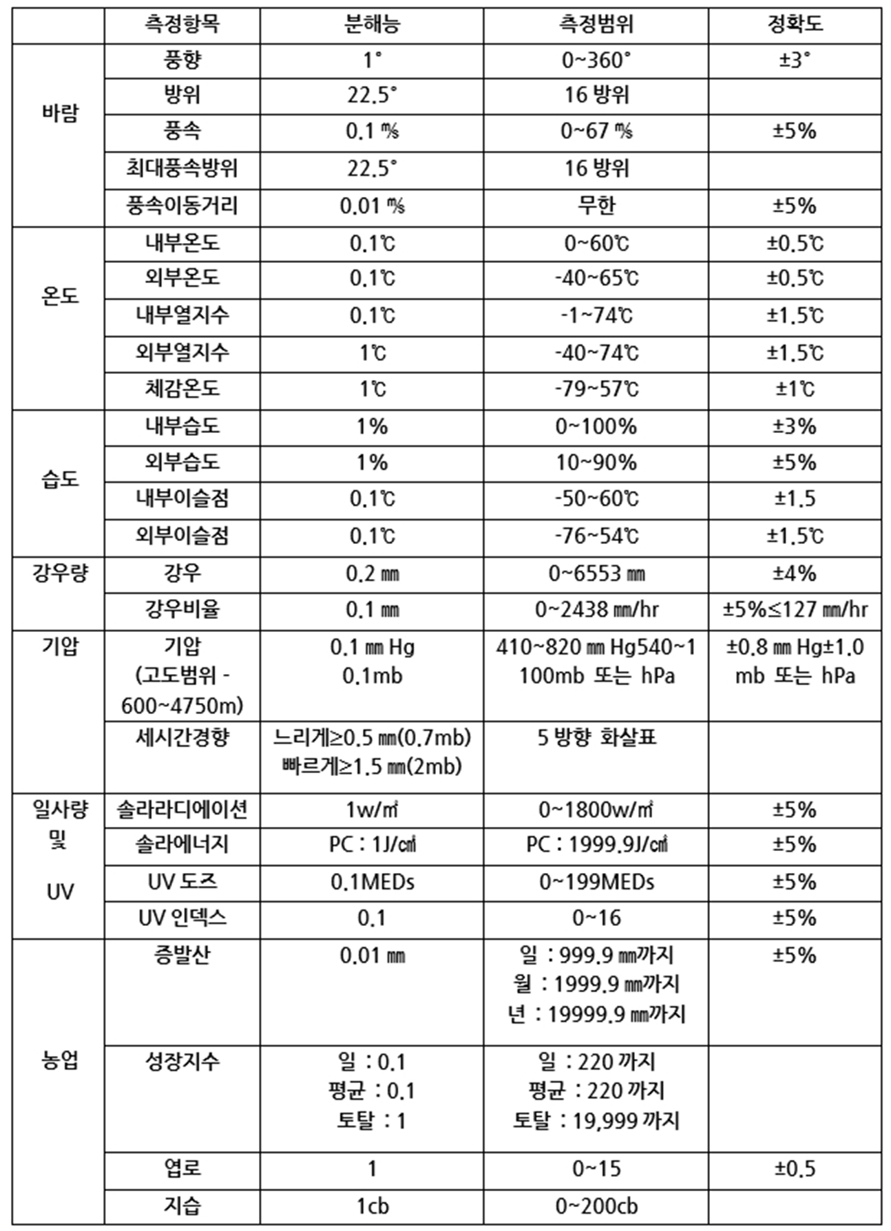● 풍향, 풍속, 온도(내외부), 습도(내외부), 강우량, 기압, 일사량, UV 등의 다양한 파라미터를 측정